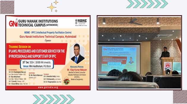 Guru Nanak Institutions Technical Campus – Intellectual Property Facilitation Centre (IPFC) for MSMEs conducted a comprehensive training session on “IP laws, procedures, and customer service for the IP professionals and support staff of IPFC” on 28.12.2024. The session featured Mr. Vijay Kumar Makyam, a distinguished Member of the District Consumer Disputes Redressal Commission (DCDRC) in Medak at Sangareddy, who served as the resource person.
