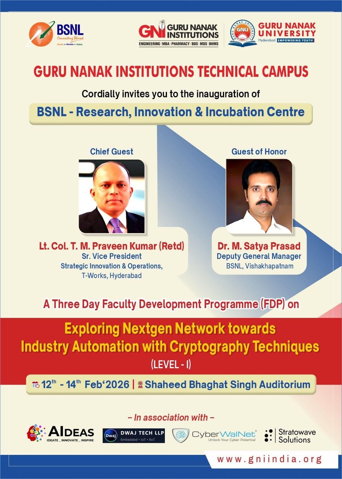 The Guru Nanak Institutions Technical Campus (GNITC) successfully hosted the inauguration of the BSNL Research, Innovation & Incubation Centre, established in association with AIDEAS, DWAJ TECH LLP, CyberWalNet and Stratowave Solutions, Which is the first BSNL Research & Innovation Incubation centre established in Telangana.  The inauguration was immediately followed by a 3-day Faculty Development Programme (FDP) on “Exploring NextGen Network towards Industry Automation with Cryptography Techniques” (Level – I). The multi-day event took place from February 12, 2026, to February 14, 2026, at the Shaheed Bhagath Singh Auditorium, Guru Nanak Institutions Technical Campus.